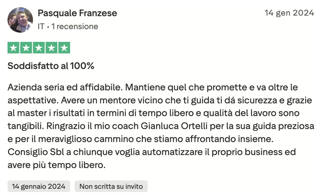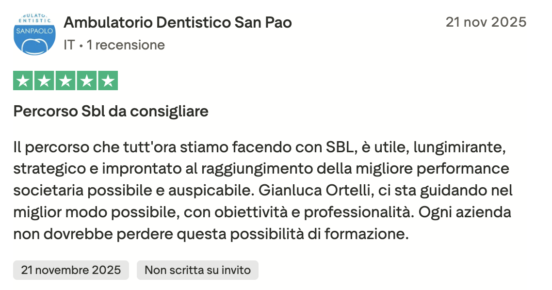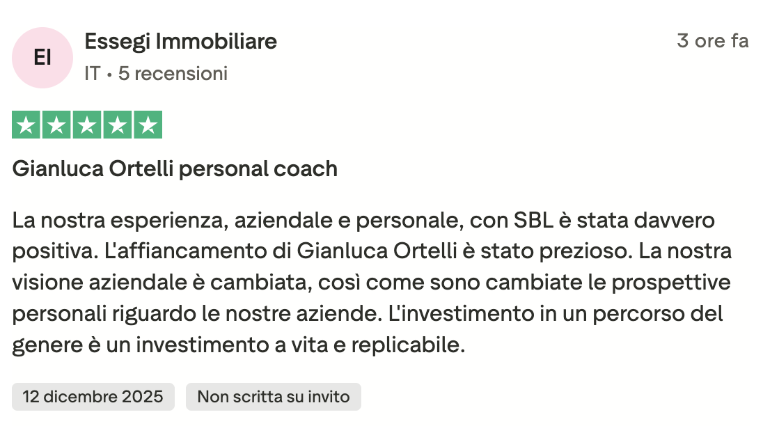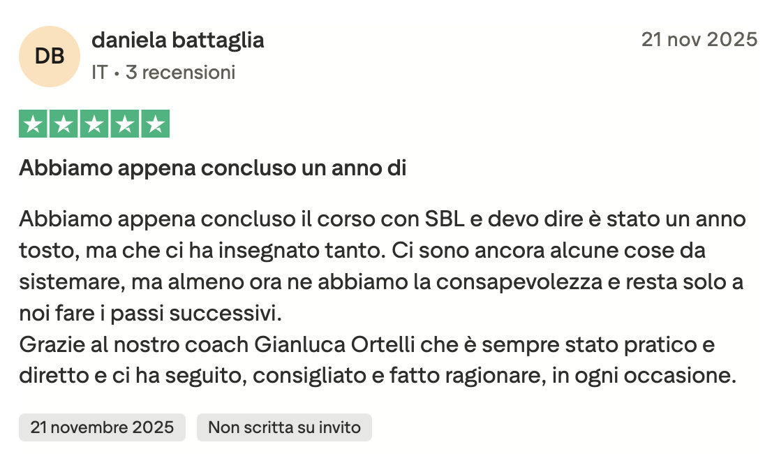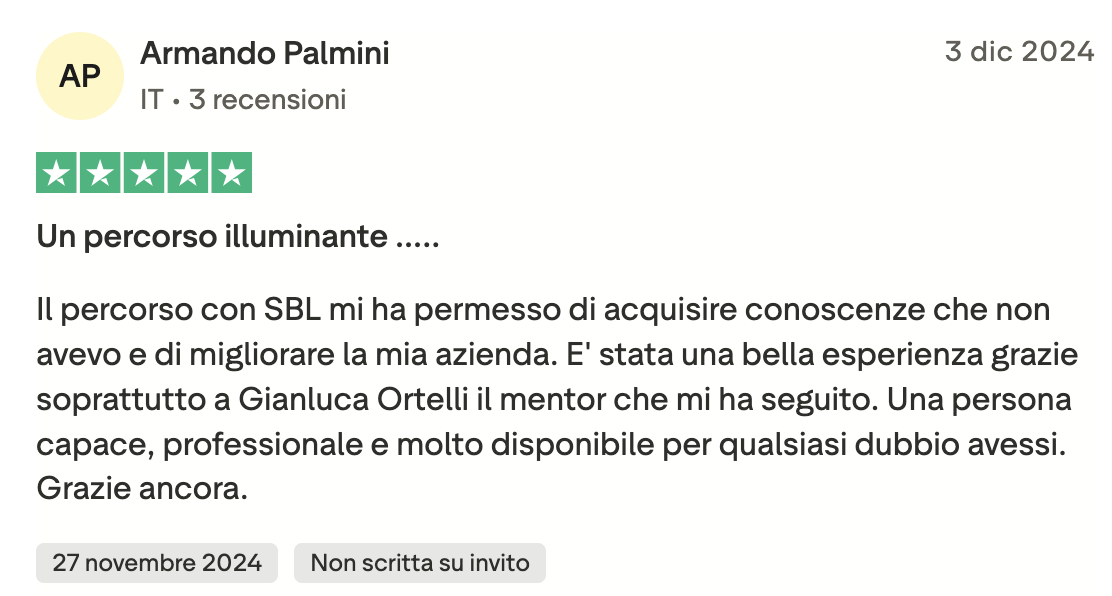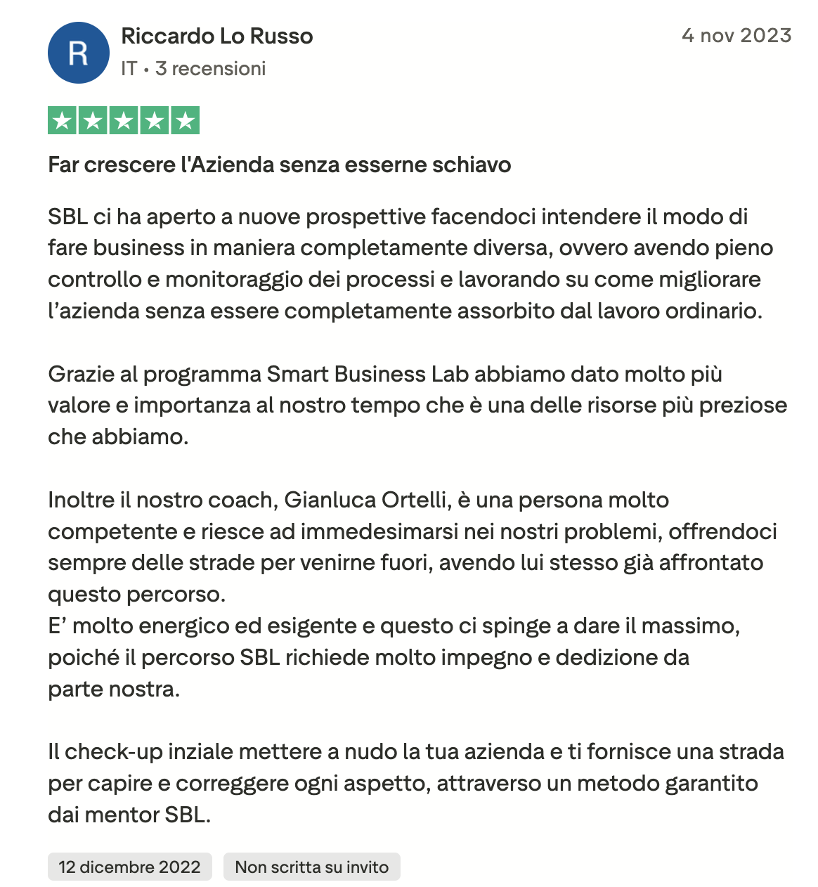 Non si tratta di una consulenza individuale, ma del percorso strutturato di Smart Business Lab, un programma che ho applicato prima sulle mie aziende e che oggi condivido con altri imprenditori come Business Mentor del team.